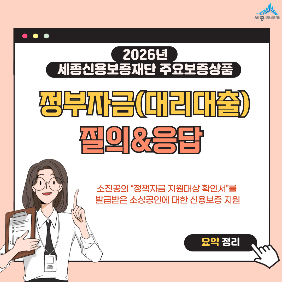 공지사항 [2026년 주요 보증 자금 안내] 작성자 관리자 작성일 2026.01.05 조회수 711 [ 1분기 주요자금 접수일정 안내 ] 자금명 정부자금(대리대출) ※ 보증신청 전 소상공인시장진흥공단 확인서 발급 필요 접수일 1월 5일(월) ~ 자금명 세종시 소상공인자금 접수일 1월 12일(월) 09:00 ~ (선착순 지원) 첨부파일 제목을_입력해주세요__복사본.zip (475.6 KB) 001.jpg (212.9 KB) 001.jpg (1.1 MB) 001.jpg (216.6 KB) 2026년-재단보증상품_QR코드_-001_(1).jpg (3.4 MB) 다운로드.zip 목록