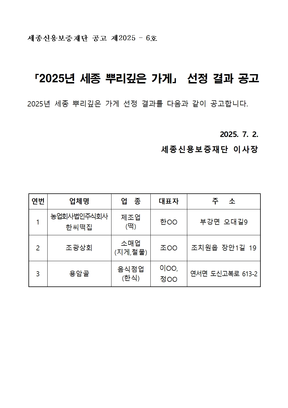공지사항 「2025년 세종 뿌리깊은 가게 」 선정 결과 공고 작성자 관리자 작성일 2025.07.03 조회수 294 첨부파일 2025년_세종_뿌리깊은_가게_선정_결과_공고.pdf (55.7 KB) 2025년_세종_뿌리깊은_가게_선정_결과_공고.jpg (237.1 KB) 다운로드.zip 목록
