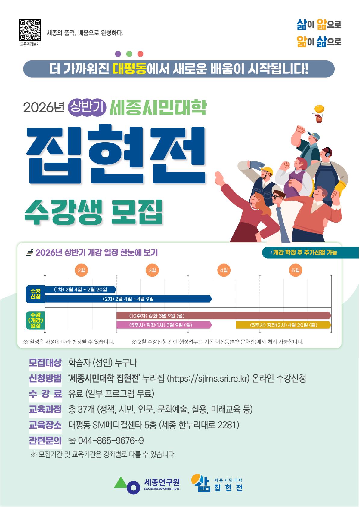 지원사업 공고 지원사업공고 내용 테이블입니다. 공지 2026년 세종시민대학 집현전 학습자 모집 작성일2026-02-04 조회수139 첨부파일 붙임1.2026년_세종시민대학_집현전_학습자_모집(포스터).pdf (568.3 KB) 붙임2.2026년_세종시민대학_집현전_학습자_모집(리플렛).pdf (1.5 MB) 붙임1.2026년_세종시민대학_집현전_학습자_모집(포스터).jpg (193.1 KB) 붙임2.2026년_세종시민대학_집현전_학습자_모집(리플렛).jpg (496.4 KB) 다운로드.zip 목록