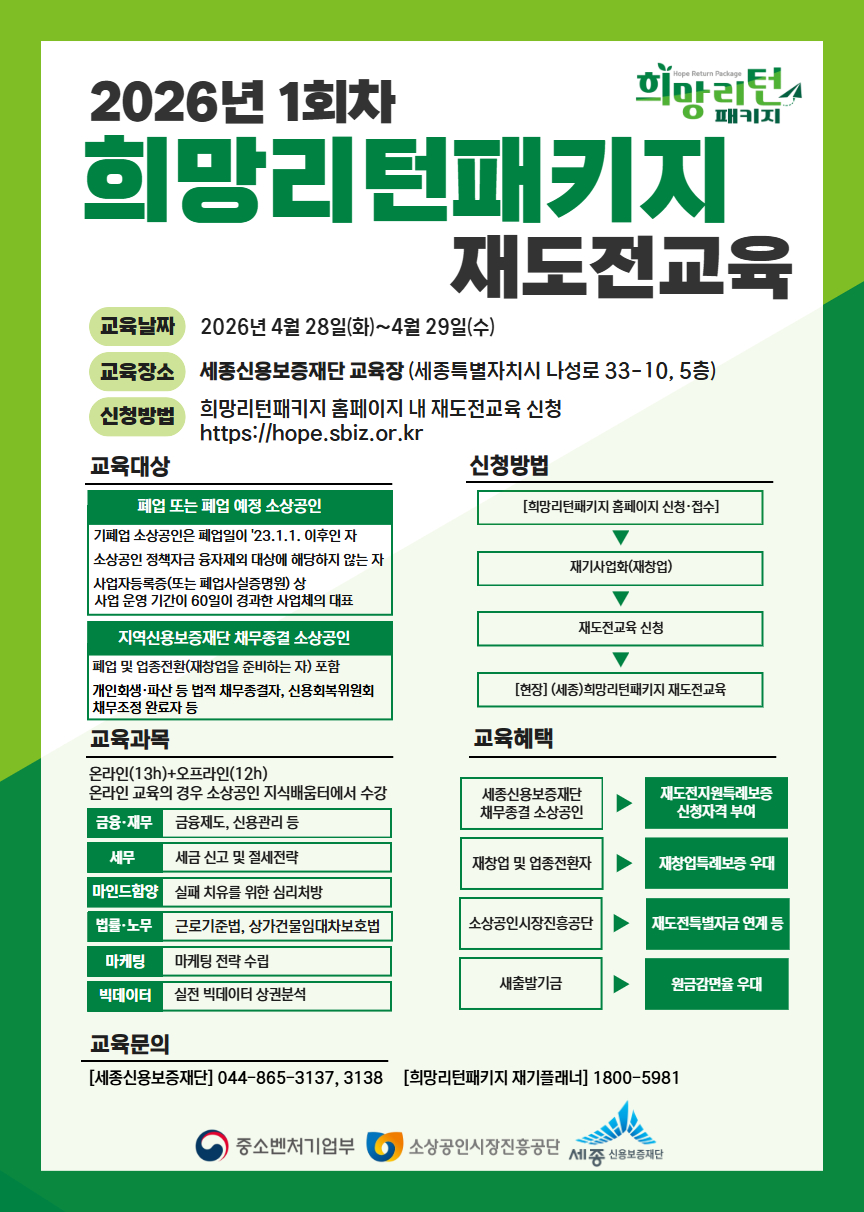 지원사업 공고 지원사업공고 내용 테이블입니다. 접수중 2026년 1회차 희망리턴패키지 재도전교육 작성일2026-04-06 조회수84 첨부파일 세종2026년_재도전교육_포스터.jpg (580.8 KB) 목록