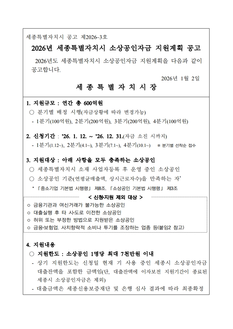 | 2026년 세종특별자치시 소상공인자금 지원계획 안내 |