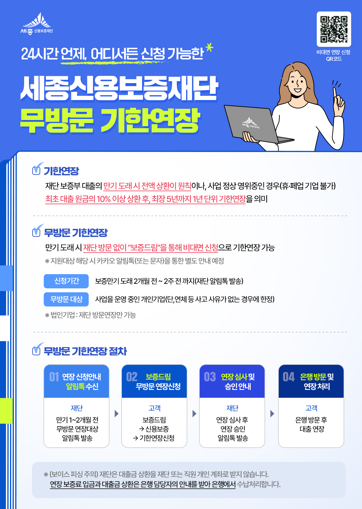 공지사항 세종신용보증재단 무방문 기한연장 안내 작성자 관리자 작성일 2024.01.15 조회수 1,403 첨부파일 240117_세종신용보증재단무방문기한연장.jpg (706.2 KB) 비대면_연장_신청.JPG (21.2 KB) 다운로드.zip 목록