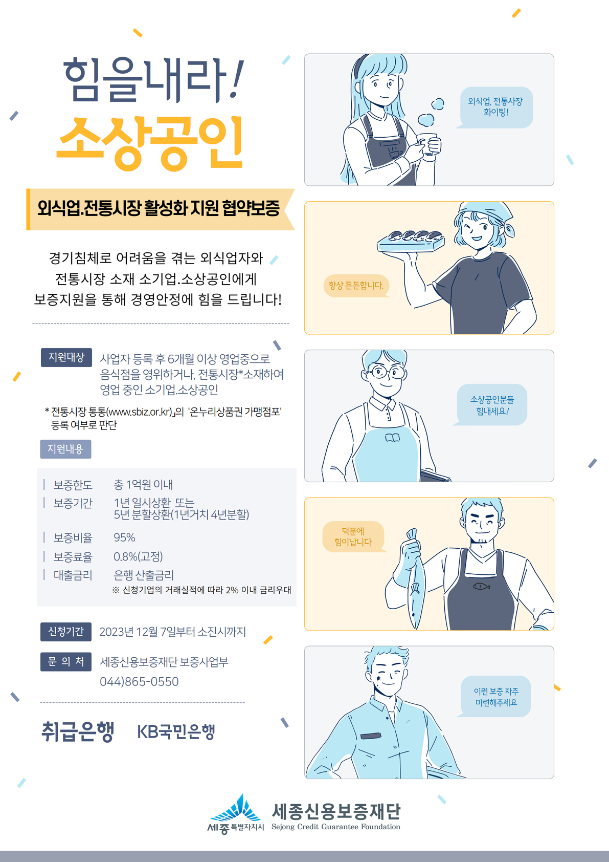 공지사항 (주요보증상품 안내) 외식업.전통시장 활성화 지원 협약보증 작성자 관리자 작성일 2023.12.07 조회수 1,862 첨부파일 외식업.전통시장_활성화_지원_협약보증_v1.pdf (455.4 KB) 외식업.전통시장_활성화_지원_협약보증.jpg (847.4 KB) 다운로드.zip 목록
