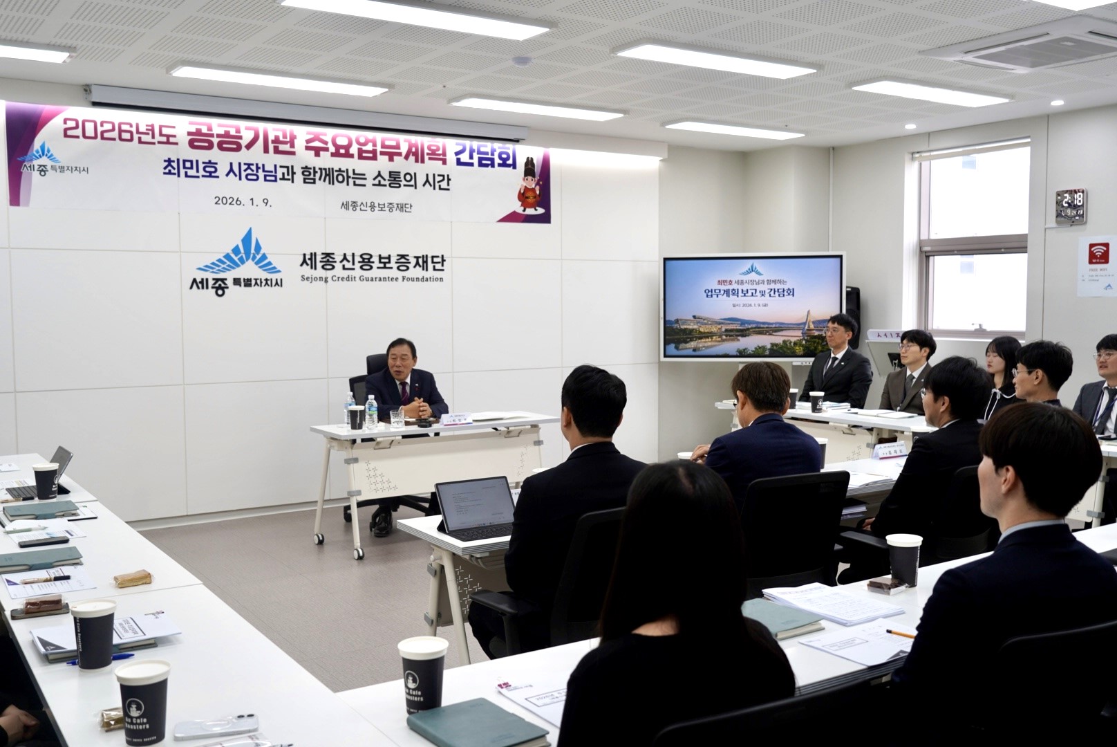 포토뉴스 2026년 공공기관 주요업무계획 간담회 개최 작성자 관리자 작성일 2026.01.14 조회수 82 일 시 : 2026. 1. 9. (금), 14시 장 소 : 세종신용보증재단 교육장 최민호 시장님은 재단에 방문하여 기관의 주요사업 및 현황, 2026년 업무계획에 대한 보고를 받았습니다. 목록