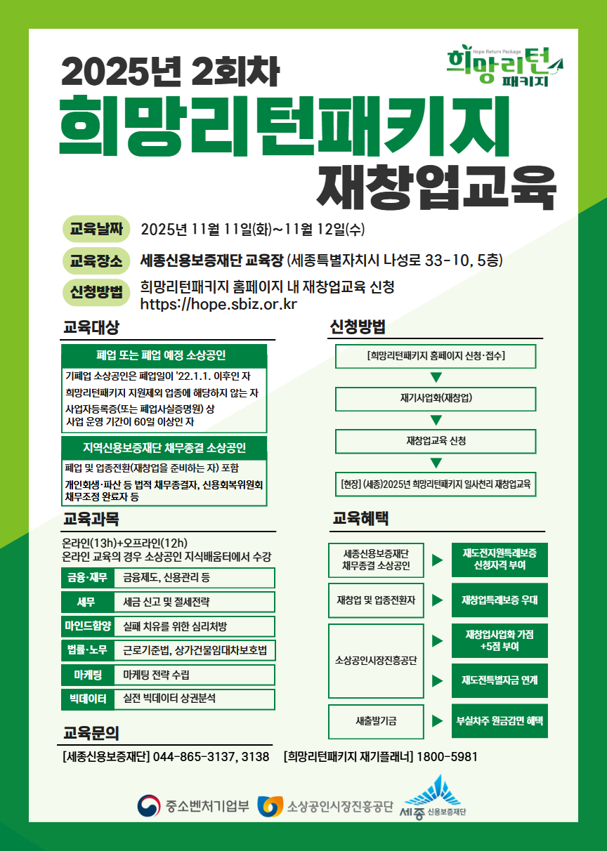 지원사업 공고 지원사업공고 내용 테이블입니다. 공지 2025년 2회차 희망리턴패키지 재창업교육 작성일2025-09-11 조회수301 첨부파일 세종재창업교육_포스터.jpg (588.7 KB) 목록